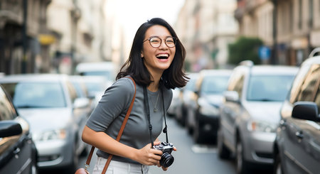 A woman with short black hair and glasses is laughing joyfully while holding a camera on a busy city street. She is wearing a gray shirt and white pants, with a brown bag slung over her shoulder. The background parked cars and buildings, indicating an urban setting. The scene is well-lit with natural daylight, capturing a moment of happiness and exploration in a bustling city environment.