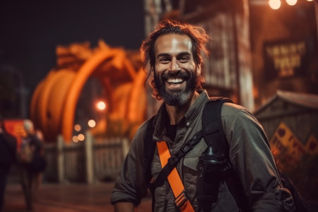 Portrait of smiling man with backpack standing on the bridge at night