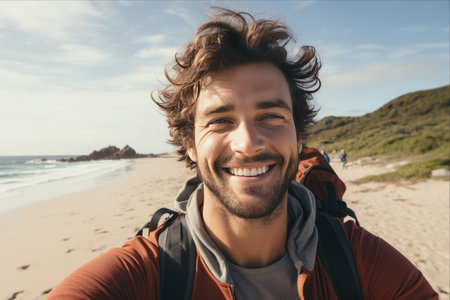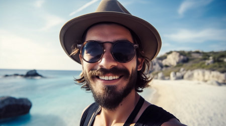 Generative AI : Handsome man wearing hat and sunglasses taking selfie picture on summer vacation day Happy hiker with backpack smiling at camera outside Tourist walking on the be