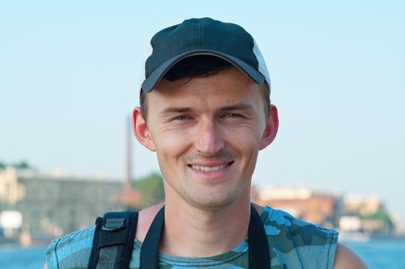 Portrait of a handsome young man in a hat with a backpack in the city
