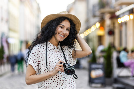 Portrait of young beautiful woman tourist with camera, Hispanic woman with curly hair in hat walking in evening city smiling and looking at camera close up.