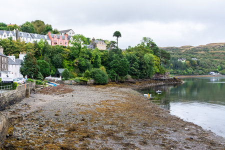 Portree, Scotland, United Kingdom – September 20, 2017. Waterfront in Portree town in the Isle of Skye, Scotland. View during low tide, with deserted beach, boats, vegetation and residential buildings.