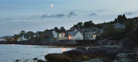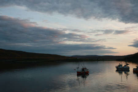 beautiful little port city at night, the harbor of Portree at night, at the Isle of Skye. Little fishing boats and reflections on the water.