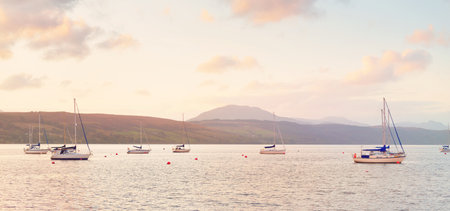 Yachts and wooden boats anchored on mooring near the shore of Gare Loch and a small village Rhu, Scotland, UK. Stunning sunset cloudscape. Travel destinations, vacations, leisure activity concepts