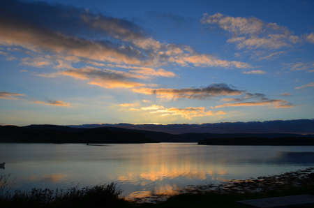 Panoramic view of the lake shores, valleys, hills and forests under ornamental stormy clouds. Twilight sky. Ardrishaig, Crinan canal, Scotland, UK. Nature, ecology, environmental conservation