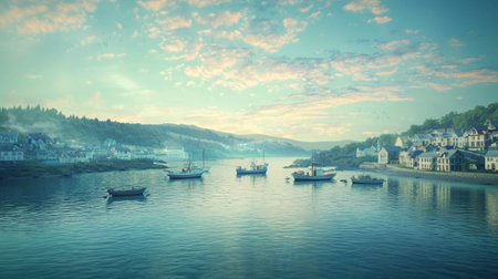 A serene coastal landscape featuring boats on calm water, surrounded by charming houses and lush hills. soft light and gentle colors create peaceful atmosphere