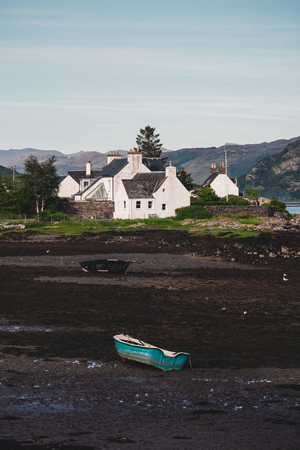 cottages in plockton scotland with the tide out and some rowing boats stranded on the seabed