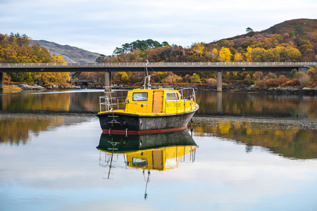 Morar, Scotland - November 2016: Small yellow fishing boat reflection in water. Bridge, mountains, trees and road in background