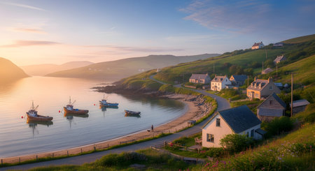 A scenic view of a tranquil coastal fishing village at dawn, with warm light illuminating the scene. Quaint houses are nestled along a winding road next to a calm bay where several small fishing boats are moored, creating a peaceful and idyllic landscape.
