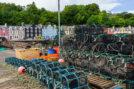 Fishing gear and Lobster traps on a pier at Tobermory in Scotland
