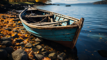 Old wooden boat floating in the water. Generative AI.