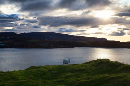 Sheep gazing at sunset, fjords of Lake Bracadale, Scotland, UK