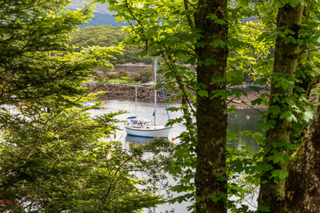 Plockton, Scotland, United Kingdom – September 20, 2017. Waterfront in Plocton, Scotland. View during low tide, with cabbage palm trees, residential buildings and cars.