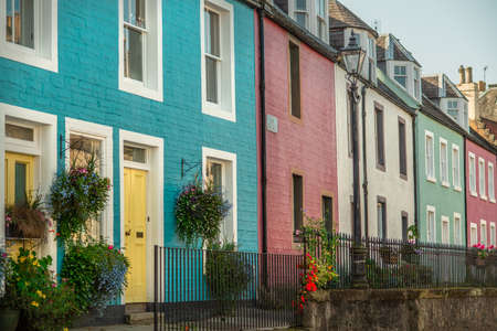 Colorful Terrace Houses and Hanging Baskets on a Street in South Queensferry, Scotland