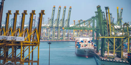 Container Cargo freight ship with working crane bridge for Logistic Import Export background