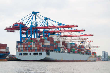 A container ship is in a container terminal in the harbor of hamburg, Germany. A ship lies not more than one day in the terminal.