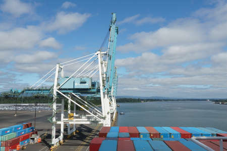 Gantry cranes ready for cargo operation parked behind merchant ship moored in container terminal on Columbia river. In background trees and bushes under blue sky with clouds.