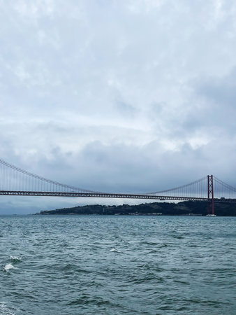 Overcast day by the red suspension bridge near Lisbon, Portugal, with calm ocean backdrop.