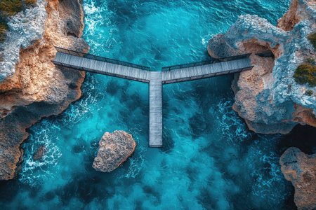 A drone photograph of an open wooden walkway on the edge of a rocky cliff, overlooking blue water with crashing waves below. The bridge is made from black metal and wood planks. The rocks around it have deep crevices filled with sea life. High-resolution photography, natural lighting, sharp focus, and insane detail. --chaos 30 --ar 3:2 --quality 2 --stylize 500 --v 6.1 Job ID: 219103ce-035f-4360-ac41-bdda888516c7