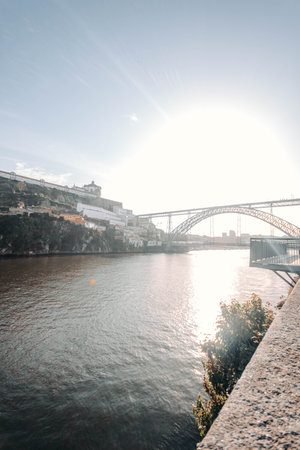 Sun shining through the Dom Luis I bridge in Porto, Portugal