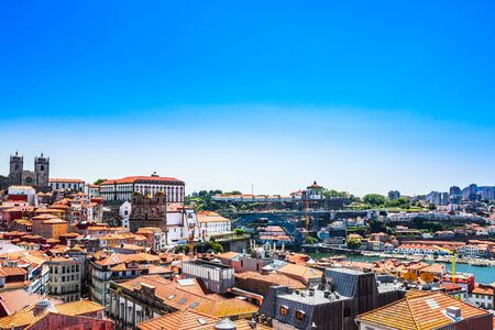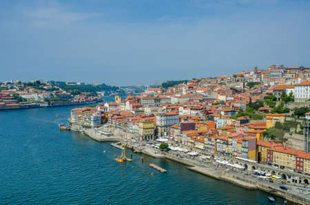 Porto, Portugal, amazing view of Riberia district with historical houses and Douro river seen from Ponte de Dom Luis bridge