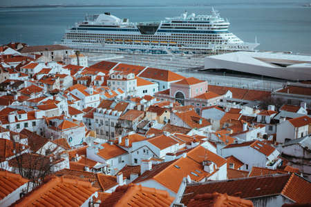 Rooftopspanorama of the oldest district Alfama in Lisbon. Cruise boat on the Tagus River. Lisbon Lisboa Lissabon