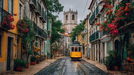 A vibrant city street is captured in a wide shot, featuring a yellow tram traveling down a cobblestone road. The composition highlights colorful buildings with flower-filled balconies and a large church in the background. This image could be used for travel promotion, tourism, or editorial content.