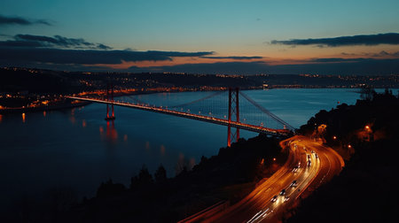 Aerial night perspective of the Vasco da Gama Bridge, its lights creating a glowing path across the vast Tagus River