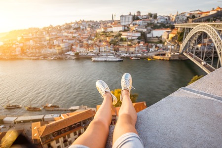 Female legs on the beautiful landscape view background during the sunset in Porto city, Portugal