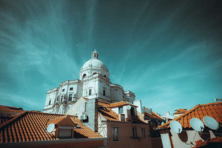 Sao Vicente de Fora Monastery and dome of the National Pantheon seen from Portas do Sol Belvedere with Alfama District rooftops. Lisbon, Portugal.