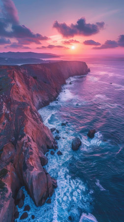 A beautiful sunset over the ocean with a rocky cliff in the background. The sky is filled with pink and orange hues, creating a serene and peaceful atmosphere. The water is calm