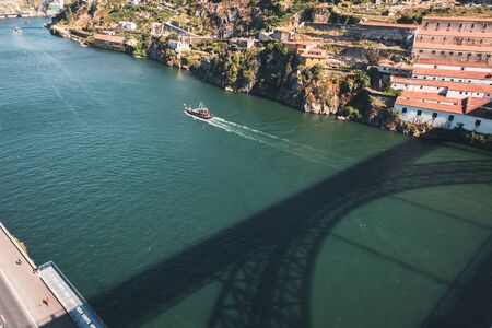 Top view of the Douro river with the shadow of Eiffel bridge in Porto, Portugal