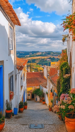 Charming White-Washed Architecture and Narrow Cobblestone Streets in Obidos, Portugal, Stunning View