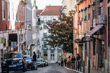 Lisbon, Portugal - January 2, 2025: View of an old street in central Lisbon at sunset