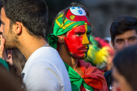 PORTO, PORTUGAL - JUL 10, 2016: Portuguese fans during video translation of the football match Portugal - France final of the European championship 2016, in Liberdade Square at city center of Porto.