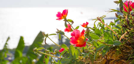 Blooming Purslane on the balcony, Beautiful multi-colored Purslane flowers, in the succulent family.
