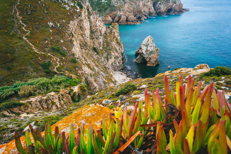 Cabo da Roca is the extreme point of Europe. Hidden beache with Rock, blue clear waters and foliage. Atlantic Ocean, Sintra, Portugal