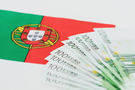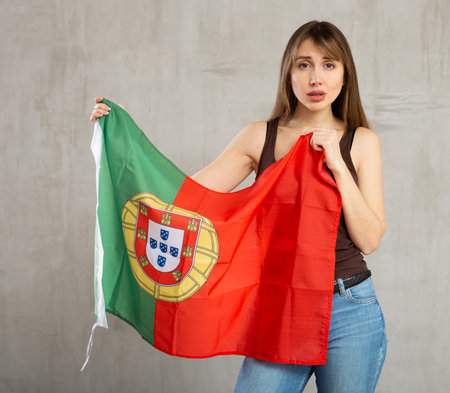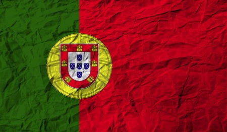 QATAR, DOHA, JULY 18, 2022: Portugal National flag and logo of FIFA World Cup in Qatar 2022 on red carpet. Soccer sport background, edit space. Qatar 22 Wallpaper. National symbol, football event