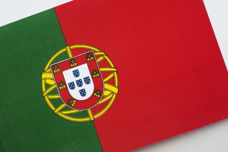 Portugal flag with two red carnation flowers for honour of veterans or memorial day on teal, sea-green blurred natural wood wall. Portugal glory to the heroes of war concept.