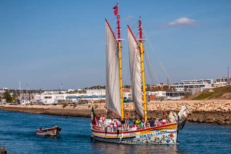 LAGOS, PORTUGAL - OCTOBER 23, 2021: Beautiful typical ornated sailboat with floral designs used for lifestyle tourism in Lagos, Portugal.
