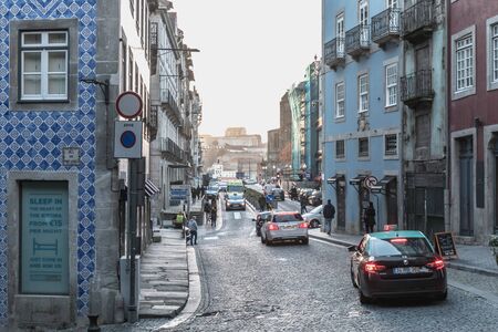 Porto, Portugal - November 30, 2018: Architecture detail and street atmosphere in the historic city center where people walk on a winter day