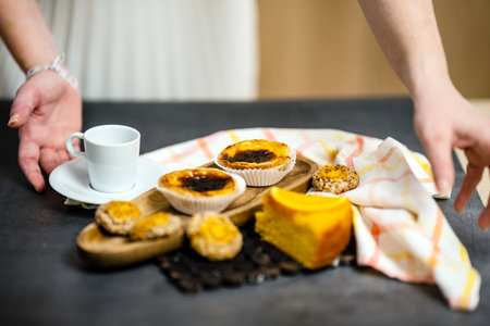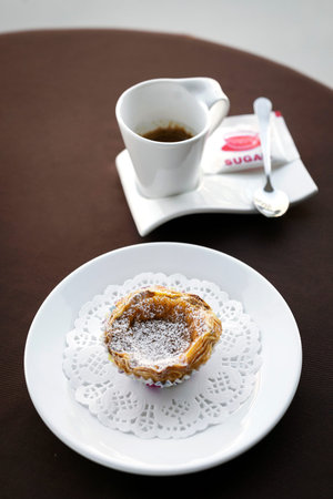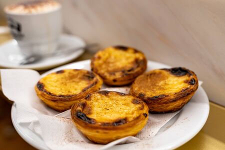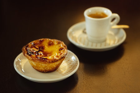 Portuguese traditional desert called pasteis de nata with cup of coffee inside of coffee shop