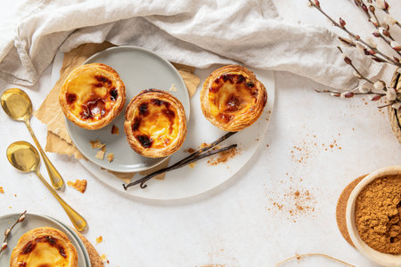 A collection of Pastel de Nata, traditional Portuguese custard tarts, are arranged on plates with vanilla beans and willow branches. Top view