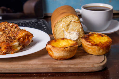 Portuguese custard tarts , popia, swiss roll with cream , cup of coffee and laptop on wooden table