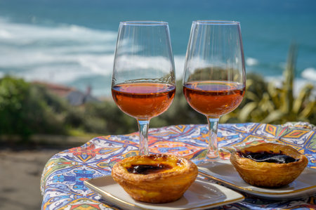 Portugal's traditional food and drink, glass of porto wine or muscatel de setubal, sweet dessert Pastel de nata egg custard tart pastry served with view on blue Atlantic ocean near Sintra in Lisbon area, Portugal
