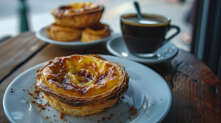 Portuguese egg tart pastry Pastel de nata on a plate with a cup of black coffee