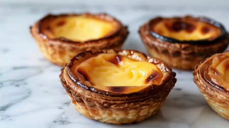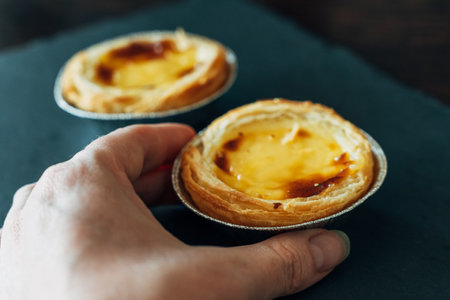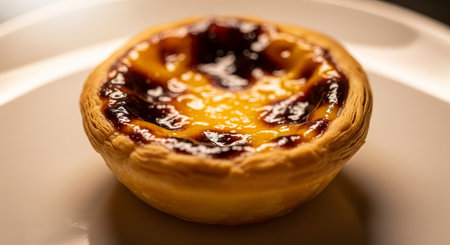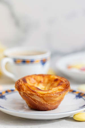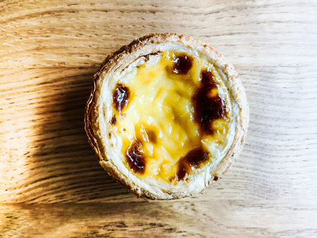 Close-up of Pastel de nata (Portuguese: pasteis de nata), a famous Portuguese egg custard tart pastry