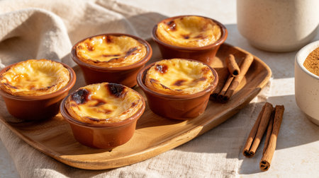Pasteis de Nata or Belem Tart. Portuguese Custard made with Egg, Cinnamon, Sugar and Flour on Wooden Plate. Traditional Dessert.