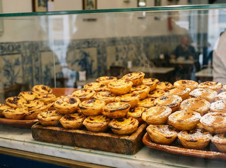 Traditional Portuguese egg tart (Pasteis de Nata) in the window of a local pastry shop in Lisbon, Portugal