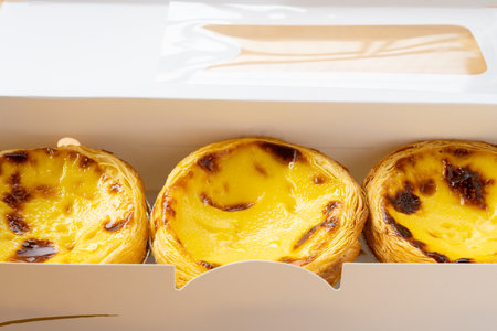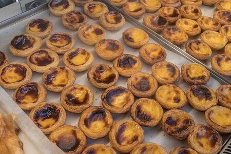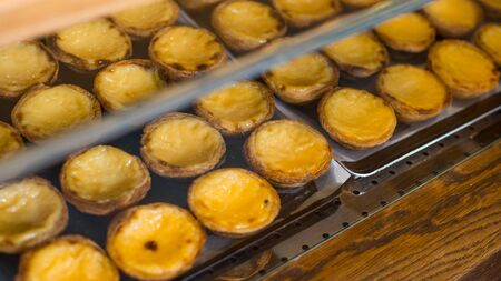 Egg tart, traditional Portuguese dessert, pastel de nata in the tray at bakery shop front. Food concept
